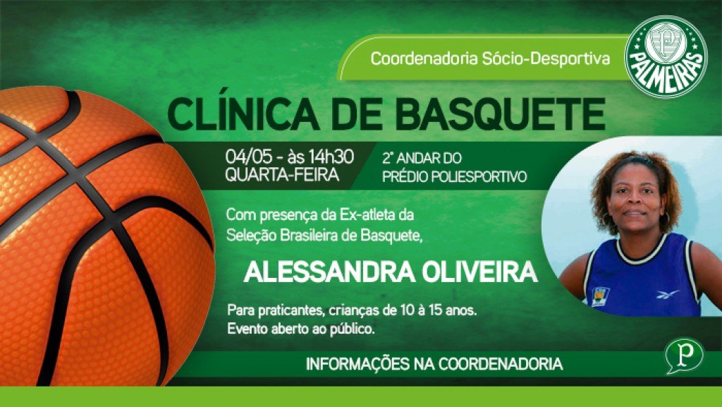 A clínica será realizada na quadra do segundo andar do prédio poliesportivo do Verdão – maiores informações na Coordenadoria Sócio-Desportiva. Alessandra Oliveira conquistou a medalha de prata nos Jogos de Atlanta-EUA, em 1996, e a medalha de bronze nos Jogos de Sidney-AUS, em 2000. Além disso, foi campeã mundial de basquete em 1994, na Austrália.