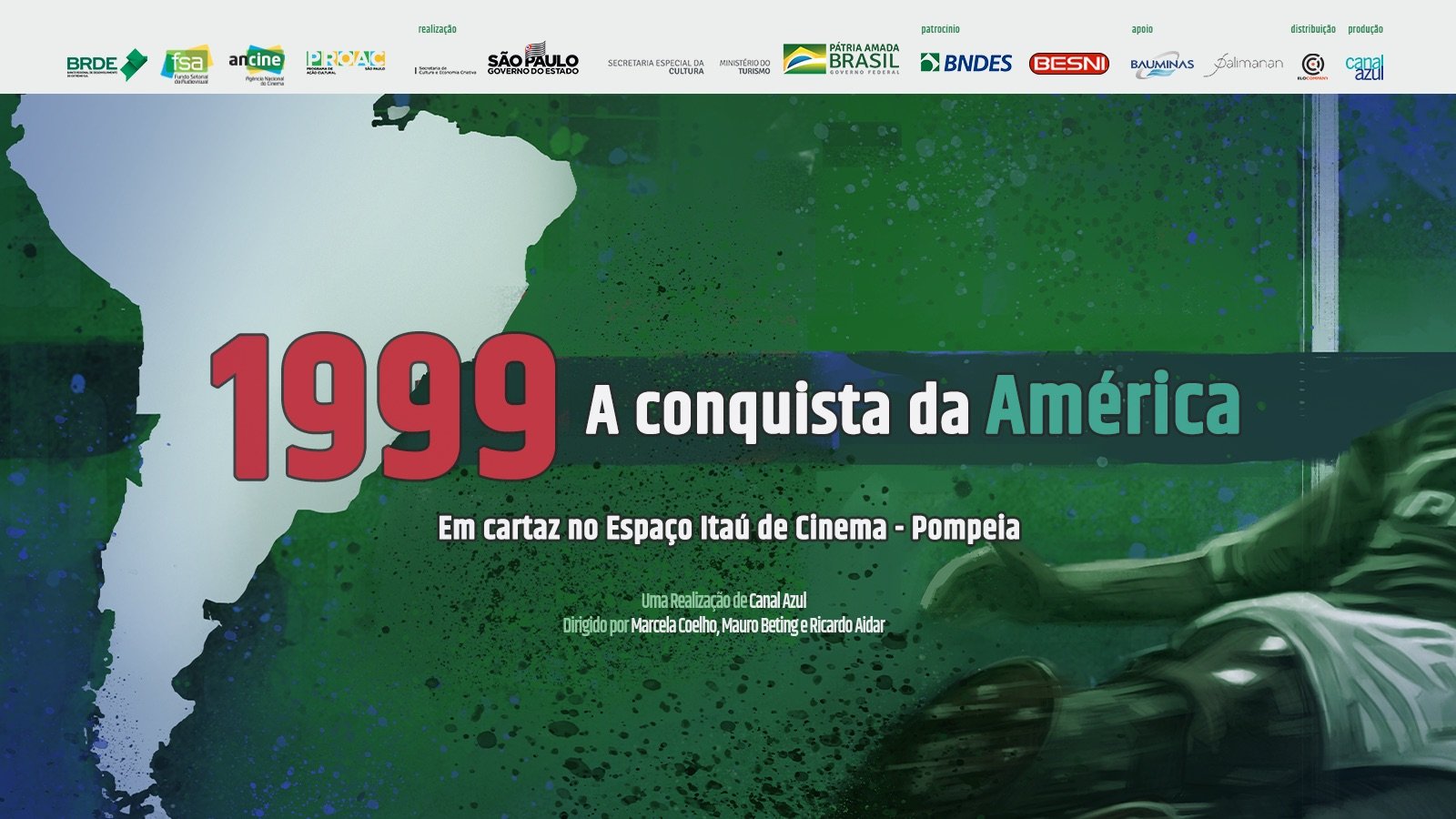Documentário em homenagem ao primeiro título de Libertadores da história do Palmeiras, o filme “1999 – A conquista da América” estará em exibição a partir desta quinta-feira (31) até o próximo dia 10 no Espaço Itaú de Cinema – Pompeia, no Bourbon Shopping São Paulo, na capital paulista, em sessões às 16h40 e 20h40.