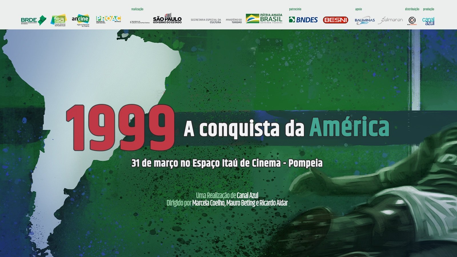 O primeiro título do Palmeiras na Copa Libertadores, conquistado em 1999, virou filme e estará em cartaz a partir do dia 31 de março no Espaço Itaú de Cinema – Pompeia, no Bourbon Shopping São Paulo, em São Paulo-SP, com sessões às 16h30 e às 20h30. O filme “1999: A Conquista da América” é a conclusão de uma saga de documentários palestrinos que começou com “12 de junho de 1993 – O dia da paixão palmeirense” e teve também “Palmeiras – O Campeão do Século”, todos produzidos pela Canal Azul.