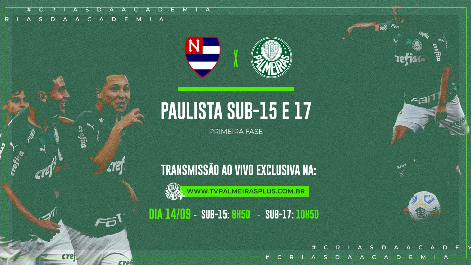 As equipes Sub-15 e Sub-17 do Palmeiras encaram o Nacional nesta terça-feira (14), em duelos atrasados pela terceira rodada do Campeonato Paulista. O Sub-15 entra em campo às 9h, enquanto que o Sub-17 joga logo em seguida, às 11h. Ambas as partidas terão transmissão exclusiva da TV Palmeiras Plus (assista aos duelos clicando aqui e aqui).