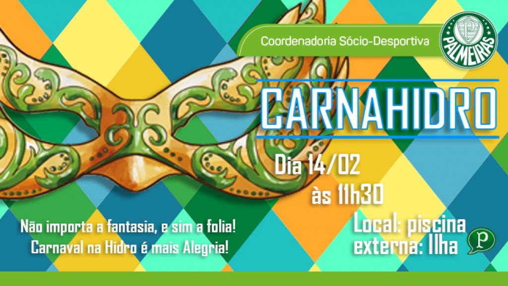 A hidroginástica do Palmeiras preparou uma aula especial para comemorar o Carnaval e entrar com alegria no ano de 2016. O evento será realizado no dia 14 de fevereiro, às 11h30, na piscina externa (ilha) do Conjunto Aquático. Não importa a fantasia, e sim a folia! Para maiores informações, entrar em contato com os professores da Coordenadoria Sócio-Desportiva. Compareça!