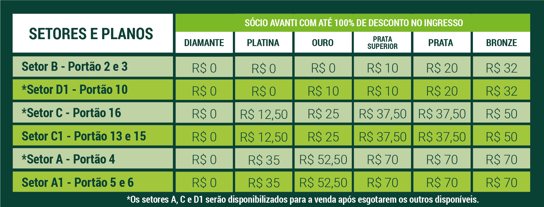 Torcedores que não fazem parte do Programa Avanti podem comprar os seus ingressos com os seguintes preços: