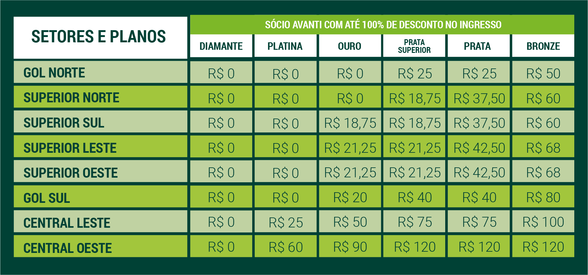 Torcedores que não fazem parte do Programa Avanti podem comprar os seus ingressos com os seguintes preços: