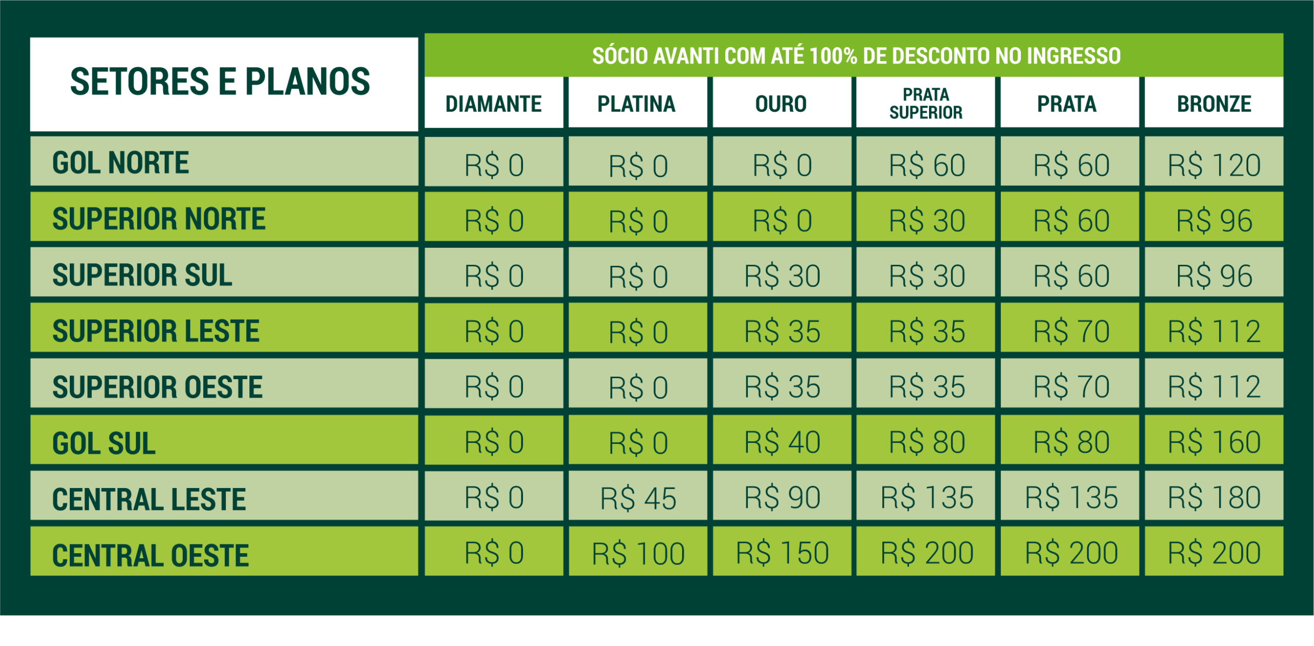 Torcedores que não fazem parte do Programa Avanti podem comprar os seus ingressos com os seguintes preços: