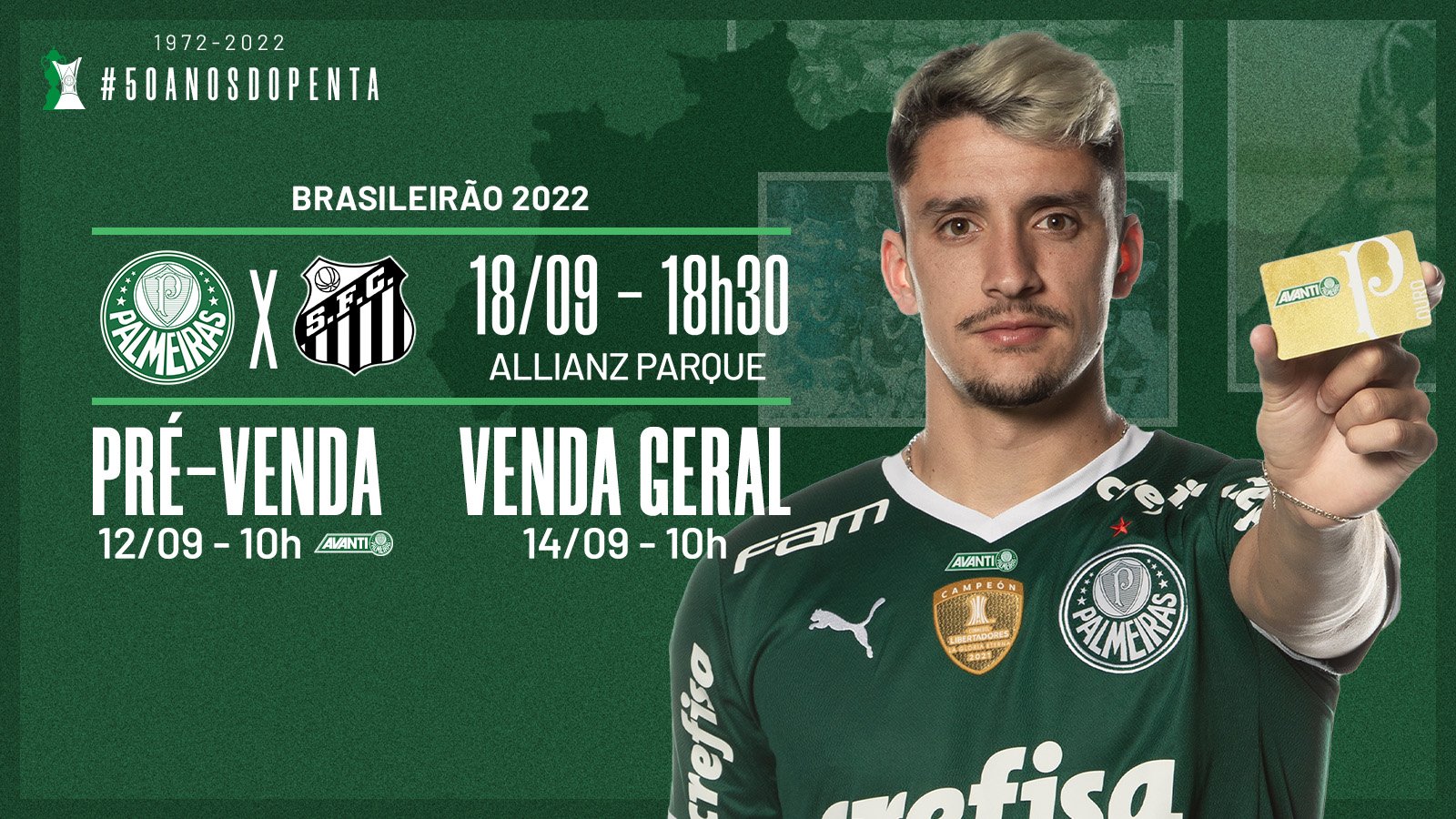 Os ingressos para o clássico contra o Santos, que ocorrerá no domingo (18), às 18h30, no Allianz Parque, pela 27ª rodada do Campeonato Brasileiro, têm preço máximo de R$ 190 e estão à venda para todos os torcedores por meio do site www.ingressospalmeiras.com.br.