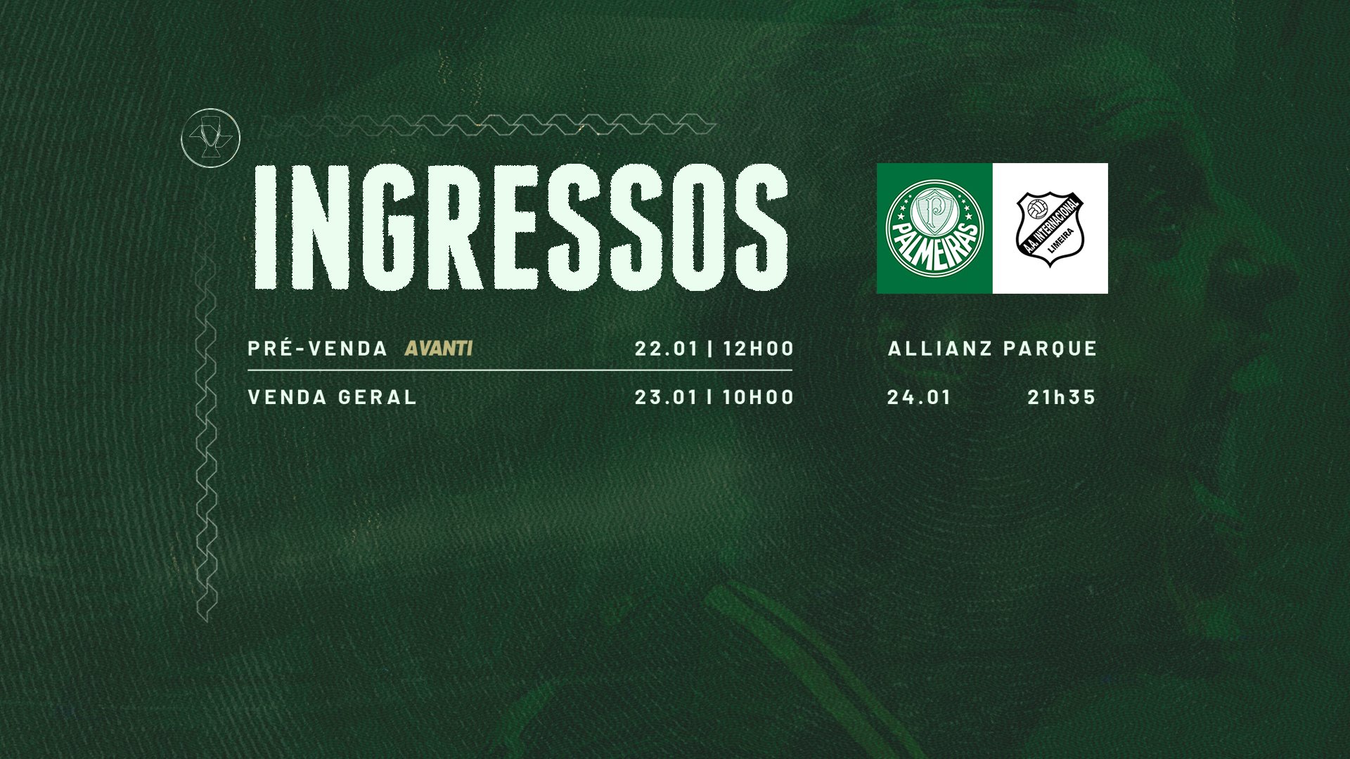 Com valores a partir de 70 reais, os ingressos para o jogo contra a Internacional de Limeira, que ocorrerá na quarta-feira (24), às 21h35, no Allianz Parque, pela segunda rodada da fase de grupos do Campeonato Paulista, estão à venda para todos os torcedores por meio do site www.ingressospalmeiras.com.br.