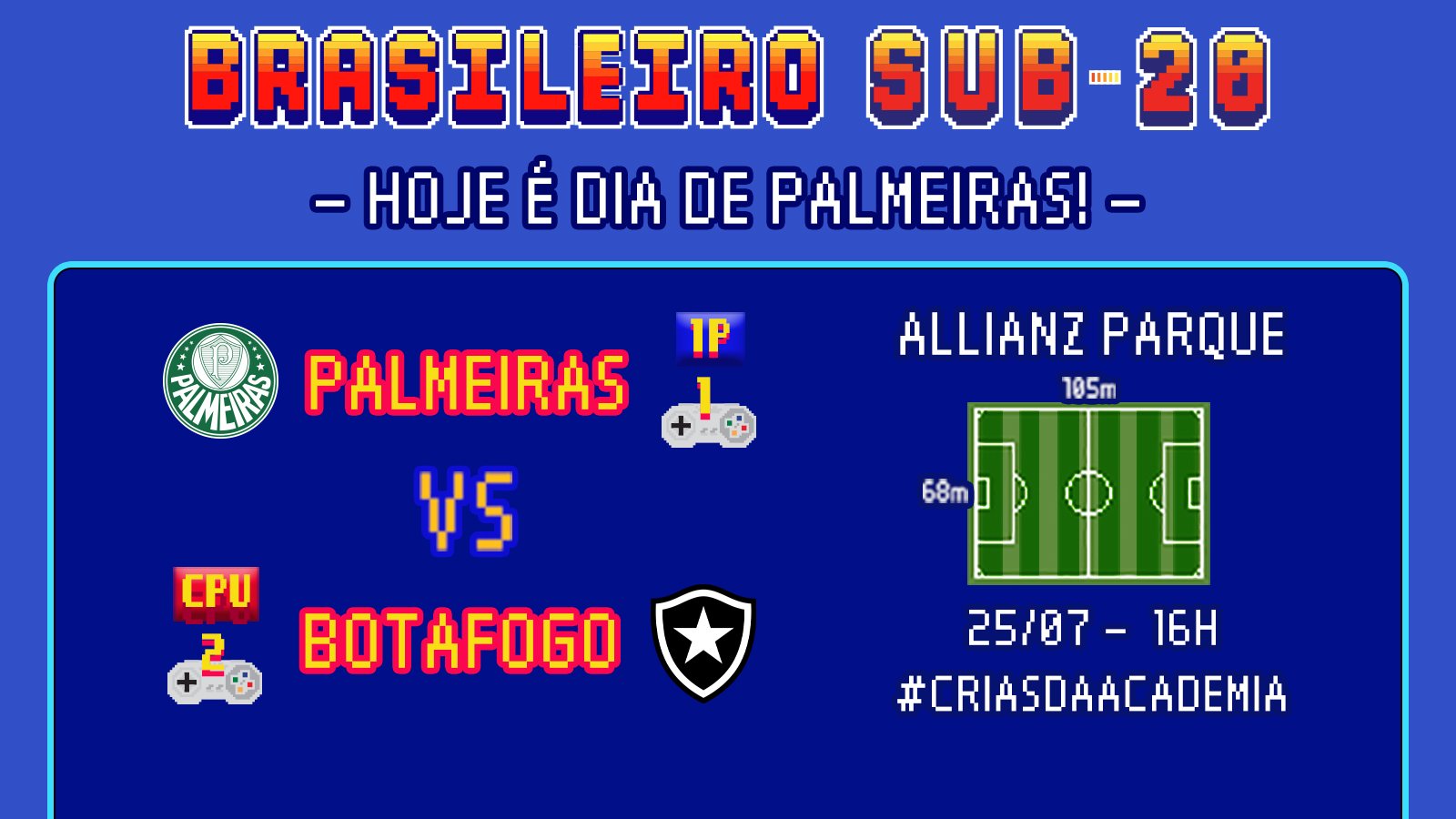 A equipe Sub-20 do Palmeiras mede forças com o Botafogo neste domingo (25), às 16h, no Allianz Parque, pela sétima rodada da primeira fase do Campeonato Brasileiro da categoria. O duelo terá transmissão da TV Bandeirantes.