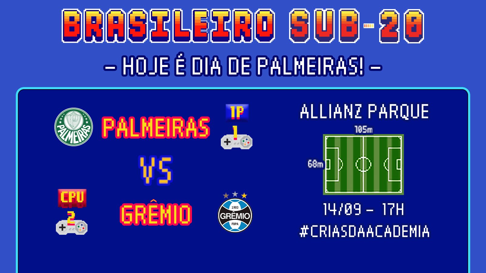 A equipe Sub-20 do Palmeiras enfrenta o Grêmio nesta terça-feira (14), às 17h, no Allianz Parque, em duelo que encerra a 15ª rodada da primeira fase classificatória do Campeonato Brasileiro da categoria. A partida será transmitida pelo SporTV.