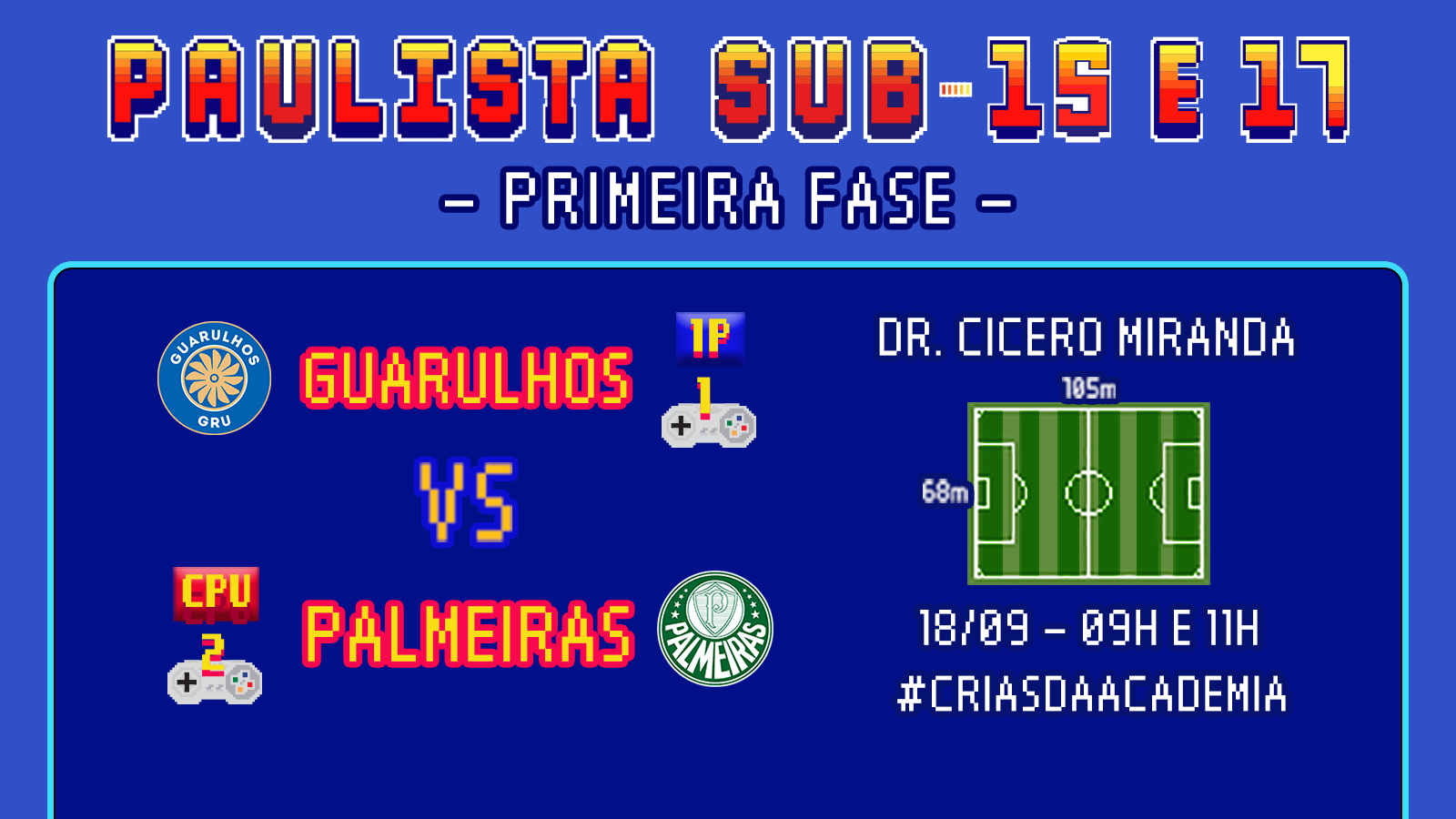 As equipes Sub-15 e Sub-17 do Palmeiras enfrentam o AD Guarulhos neste sábado (18), no estádio Dr. Cicero Miranda, em Guarulhos-SP, pela quinta e última rodada do primeiro turno do Campeonato Paulista de base. As partidas acontecem às 09h e às 11h, respectivamente.