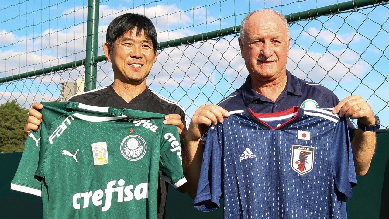 Fabio Menotti/Ag Palmeiras/Divulgação_Hajime Moriyasu e Felipão conversaram na Academia de FutebolDe olho na disputa da Copa América, realizada no Brasil, o Japão treinou nesta sexta-feira (14), na Academia de Futebol, e se tornou a primeira seleção da Ásia a realizar atividades no centro de treinamento palestrino em toda a história. A delegação japonesa foi presenteada com livros sobre a história do clube e camisas oficiais do Alviverde, entregues pelo técnico Luiz Felipe Scolari ao treinador do Japão, Hajime Moriyasu.