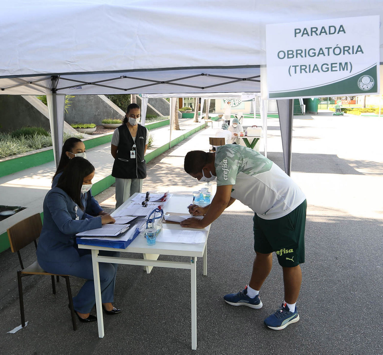 O elenco profissional do Palmeiras foi submetido nesta segunda-feira (22) a mais uma rodada de testes para detectar possíveis infecções pelo novo coronavírus. Em parceria com o Hospital Sírio Libanês, três estações de triagem e coleta foram montadas na área aberta da Academia de Futebol, em frente ao Centro Crefisa Capitão Adalberto Mendes, para realização de testes RT-PCR – ou seja, por meio da coleta de material das vias aéreas.