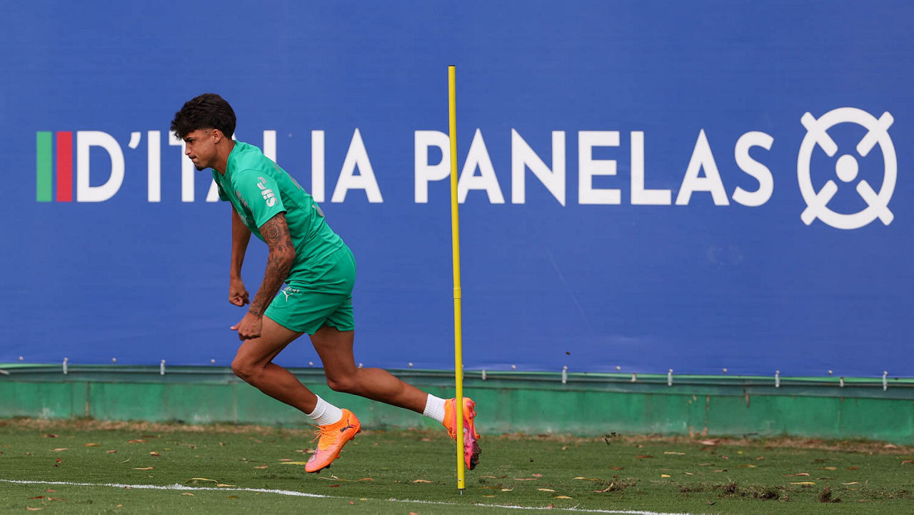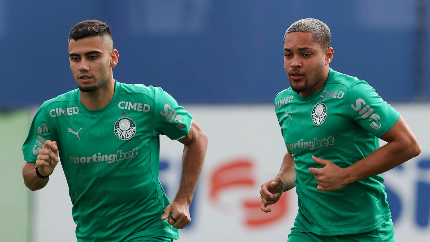 Os jogadores Andreas Pereira e Vitor Roque (à direita) durante treinamento na Academia de Futebol (Foto: Cesar Greco/Palmeiras/by Canon)