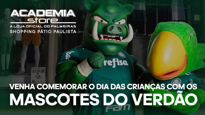 Em comemoração ao Dia das Crianças, os mascotes oficiais do Palmeiras, o Periquito e o porco Gobbato, marcarão presença na loja Academia Store do Shopping Pátio Paulista, na Zona Sul de São Paulo, no próximo sábado (13), das 13h às 17h. Os personagens palestrinos estarão no local para tirar fotos com os palmeirenses que passarem pelo estabelecimento.