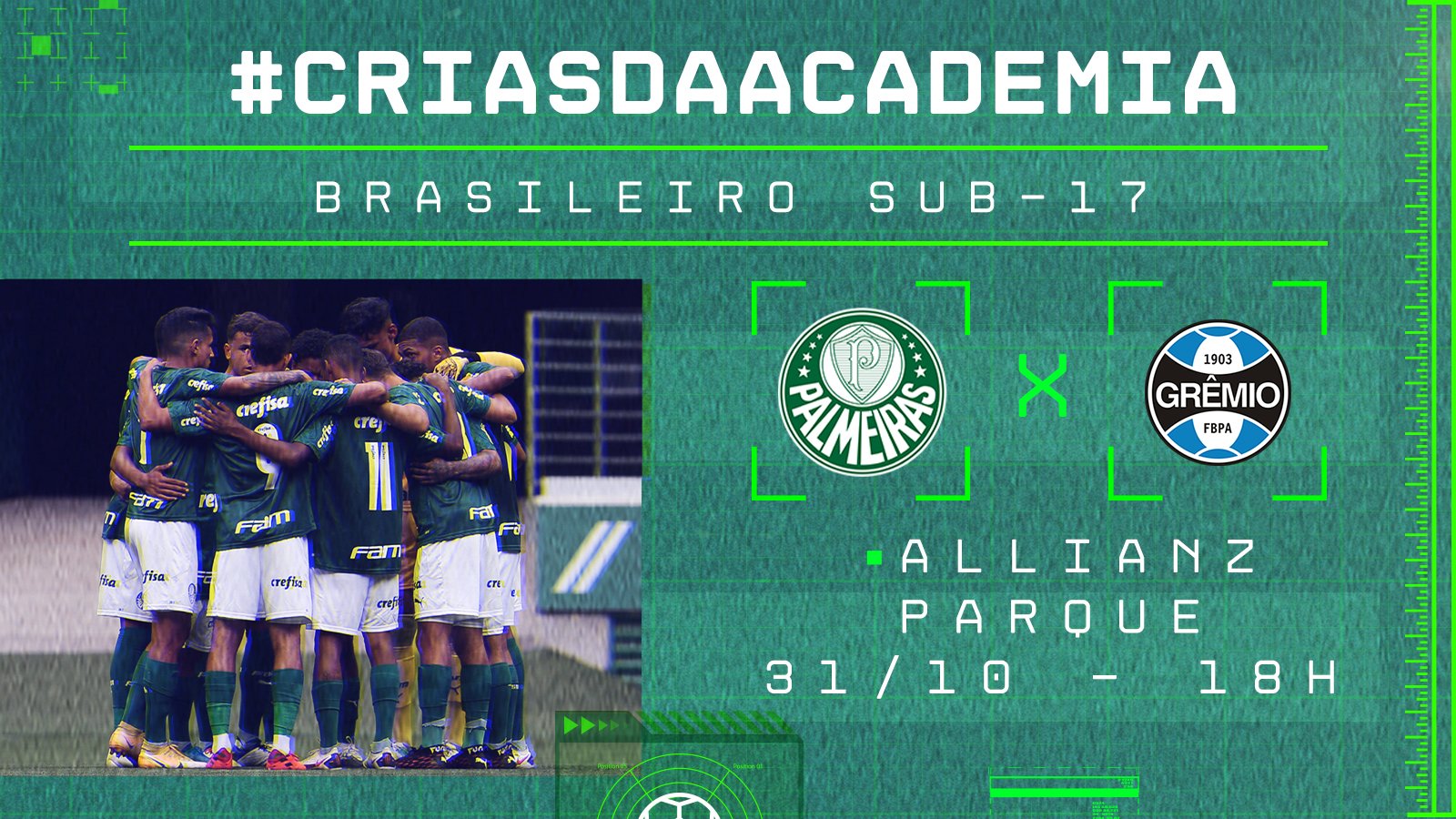 O Palmeiras mede forças com o Grêmio neste sábado (31), às 18h, no Allianz Parque, pela sexta rodada da primeira fase do Brasileiro Sub-17. O duelo será transmitido pela CBF TV (MyCujoo) e exibido também na home do site oficial do Verdão.