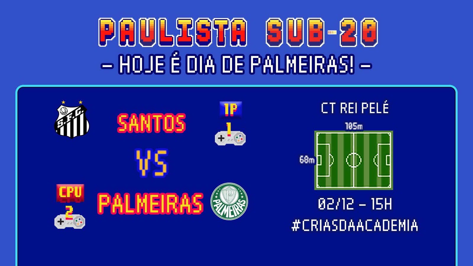 A equipe Sub-20 do Palmeiras mede forças com o Santos nesta quinta-feira (02), às 15h, no CT Rei Pelé, em Santos-SP, no duelo de ida das quartas de final do Campeonato Paulista da categoria. A partida será transmitida por Eleven Sports, Paulistão Play e YouTube.