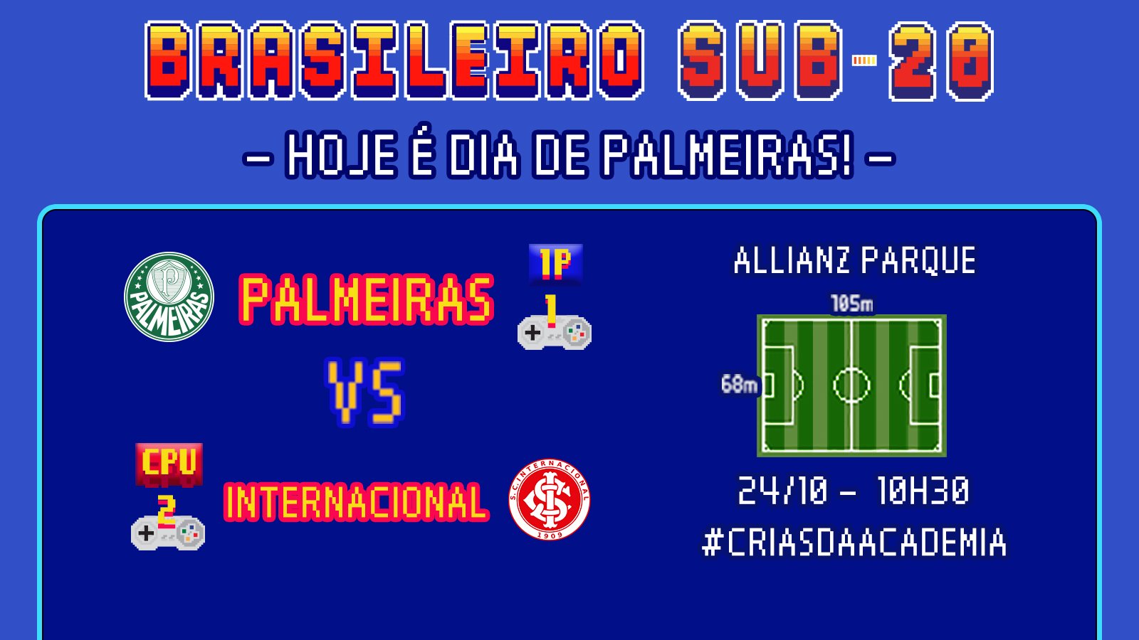 O time Sub-20 do Palmeiras recebe o Internacional neste domingo (24), às 10h30, no Allianz Parque, pelo duelo de volta das quartas de final do Campeonato Brasileiro da categoria. A partida será transmitida pela Band.