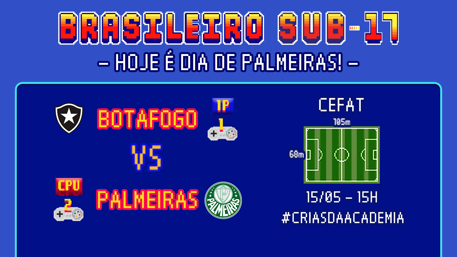 A equipe Sub-17 do Palmeiras enfrenta o Botafogo neste sábado (15), às 15h, no campo do CEFAT, em Niterói-RJ, pela segunda rodada do Campeonato Brasileiro da categoria. O duelo será transmitido pela CBF TV (MyCujoo).