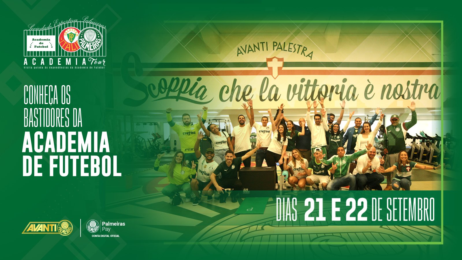 A Palmeiras Experiências, plataforma de produtos exclusivos do clube, disponibilizou novas datas para o Academia Tour: nos dias 21 de setembro (sábado), das 14h às 17h30, e 22 de setembro (domingo), das 13h às 15h, os torcedores terão a oportunidade de conhecer todos os bastidores da Academia de Futebol, que possui uma estrutura digna dos maiores clubes de futebol do mundo. Os ingressos estão à venda pelo site www.palmeirasexperiencias.com.br, com desconto especial para sócios-torcedores Avanti.