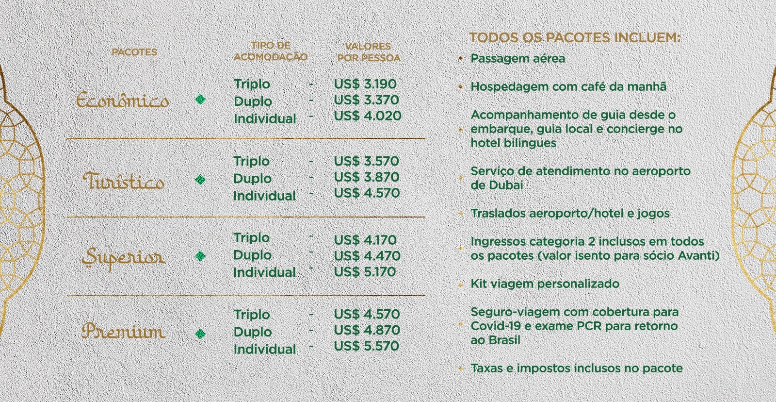 Pensando na comodidade e na segurança da Torcida Que Canta e Vibra, o Palmeiras fechou acordo com uma das maiores operadoras de turismo do país a fim de oferecer pacotes de viagem para o Mundial de Clubes da FIFA, que será realizado entre os dias 3 e 12 de fevereiro de 2022, em Abu Dhabi, nos Emirados Árabes Unidos. A Century Travel, que está no mercado há 30 anos, será a responsável pela comercialização dos pacotes a partir desta terça-feira (21) através do site www.palmeiraspelobi.com.br, com preços iniciais de US$ 3.190, parcelamento em até 21 vezes e condição especial para sócio Avanti. Confira valores na tabela abaixo.