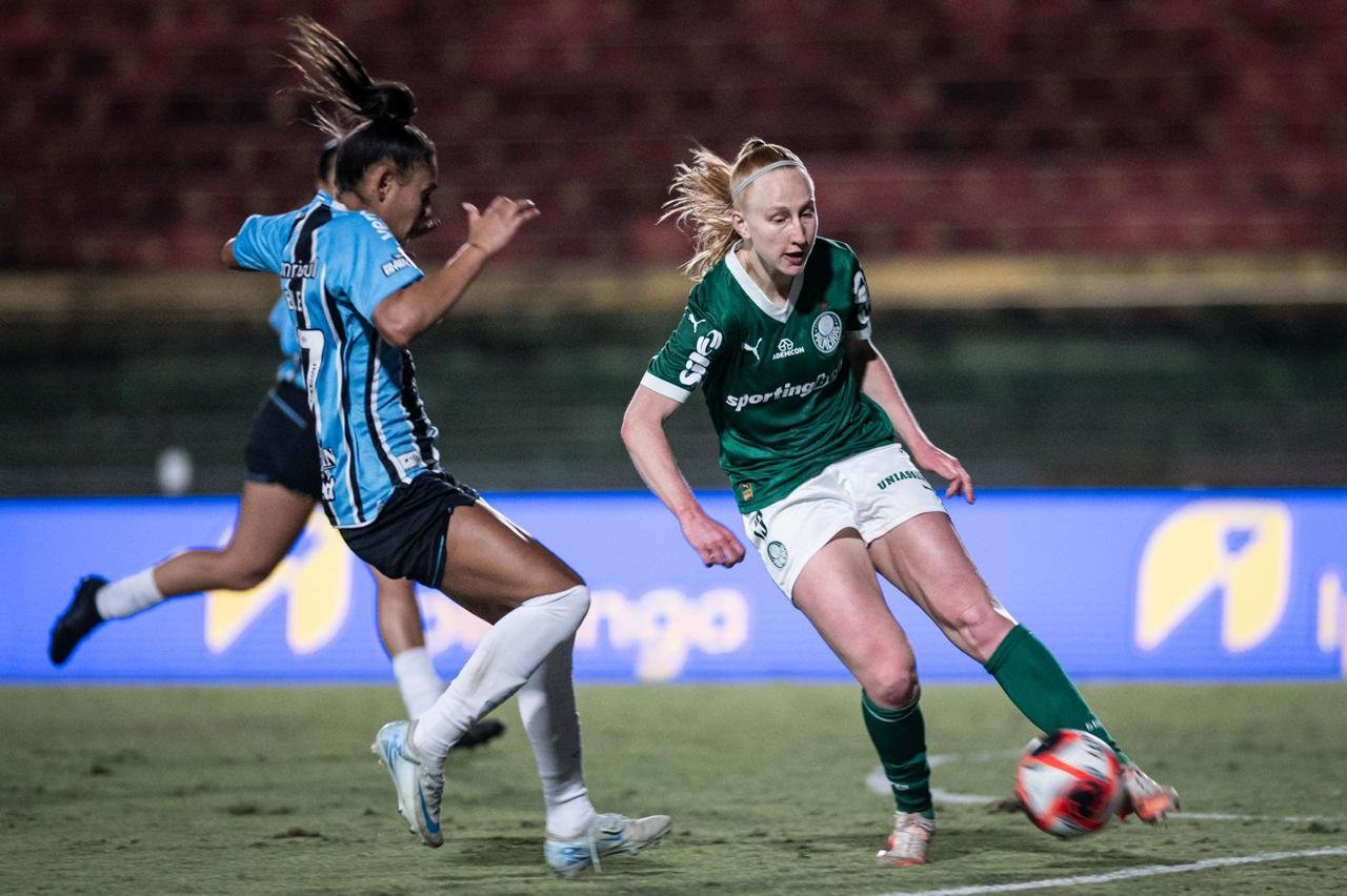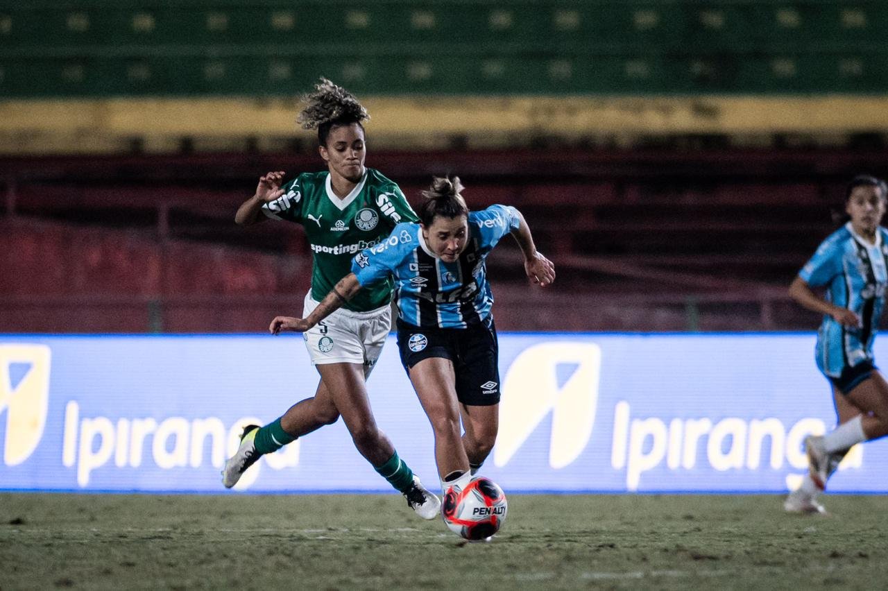 O jogo começou quente mesmo com o frio em São Paulo. O Palmeiras se lançou ao ataque e teve falta na entrada da área a seu favor. Brena Carolina, uma das artilheiras da equipe no ano, cobrou perfeitamente no lado direito da goleira para abrir o placar. Aos 39 minutos o Grêmio empatou.