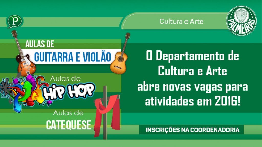 O Departamento de Cultura e Arte da Sociedade Esportiva Palmeiras iniciará as atividades de 2016 com novidades para os sócios. Trata-se das aulas de guitarra/violão e hip hop, que entram na grade do clube em fevereiro.