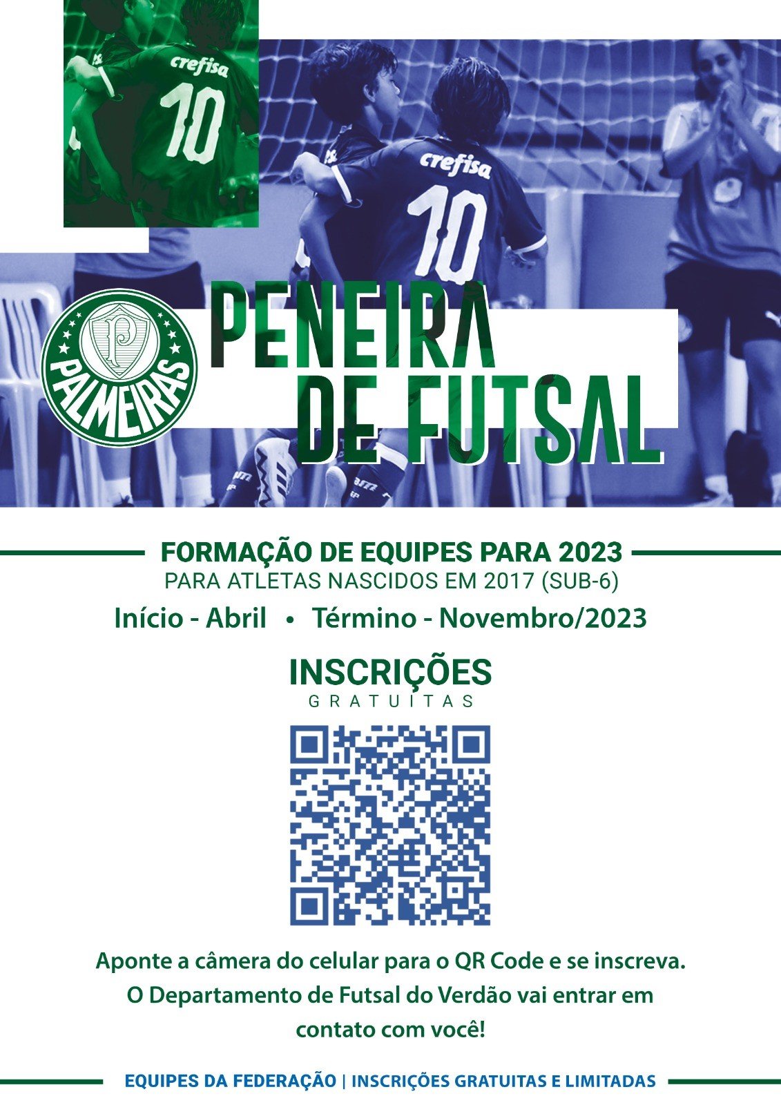O Palmeiras iniciou nesta quarta-feira (29) as inscrições para a seletiva de futsal de 2023. A peneira é destinada apenas para atletas da categoria Sub-6 (nascidos em 2017). Para participar, basta clicar aqui e preencher o formulário.