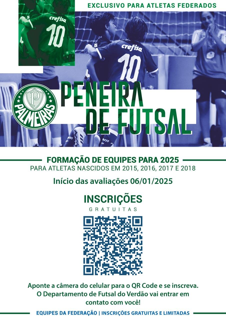 O Palmeiras abriu inscrições para a peneira de futsal da temporada de 2025. A seletiva é destinada apenas para atletas federados das categoria Sub-7, Sub-8, Sub-9 e Sub-10 (nascidos entre 2015 e 2018). Para participar, clique aqui e preencha o formulário.