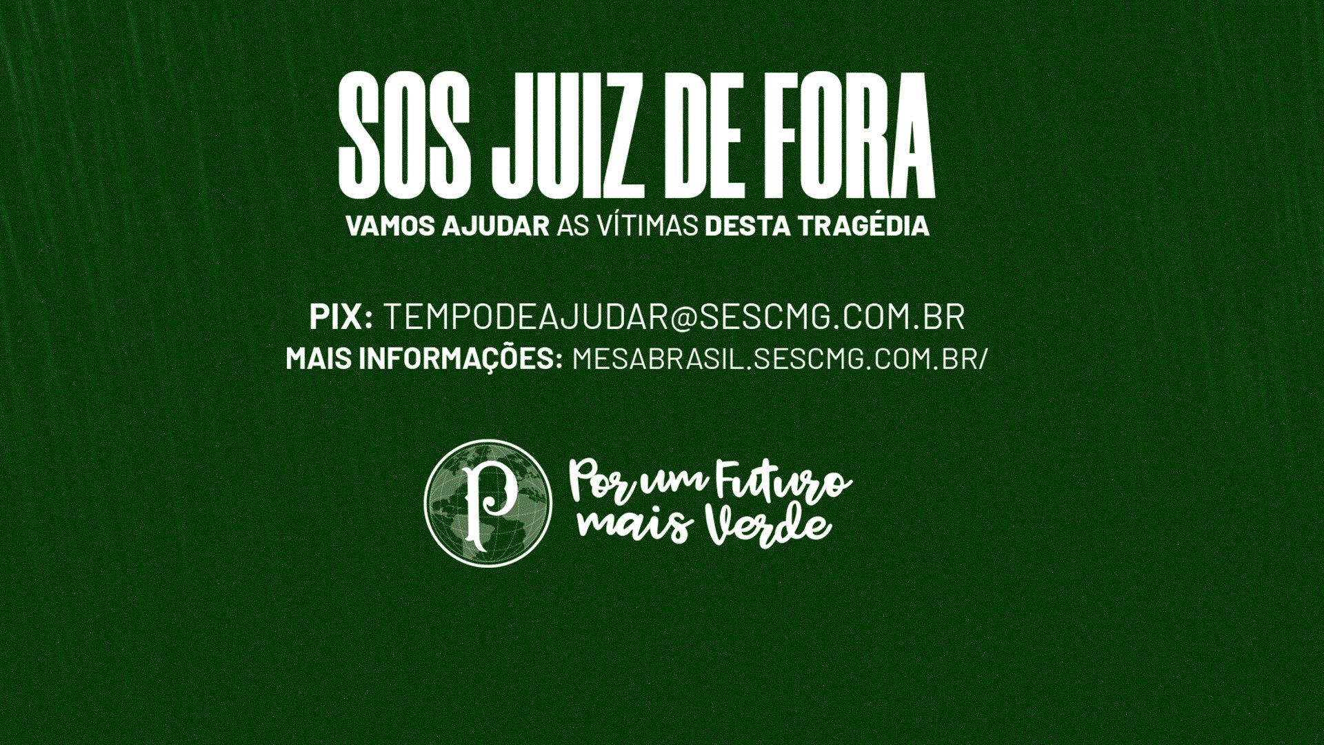 Por meio do programa de responsabilidade institucional Por Um Futuro Mais Verde, o Palmeiras aderiu à campanha promovida pela TV Integração, afiliada da TV Globo em Juiz de Fora (MG), em favor das pessoas afetadas pelas chuvas na Zona da Mata Mineira.