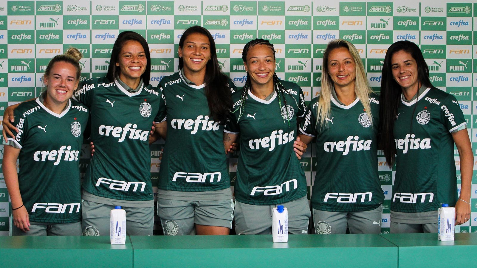 Seis das sete Palestrinas que chegaram para reforçar o Palmeiras para a temporada de 2022 foram apresentadas nesta quinta-feira (03), na Academia de Futebol, pelo diretor executivo da modalidade, Alberto Simão. A zagueira Day Silva, as meio-campistas Andressinha e Sâmia Pryscilla e as atacantes Bia Zaneratto, Byanca Brasil e Patrícia Sochor participaram de uma entrevista coletiva virtual para contar sobre a chegada ao Verdão. A goleira Amanda testou positivo para Covid-19 e não pôde comparecer.