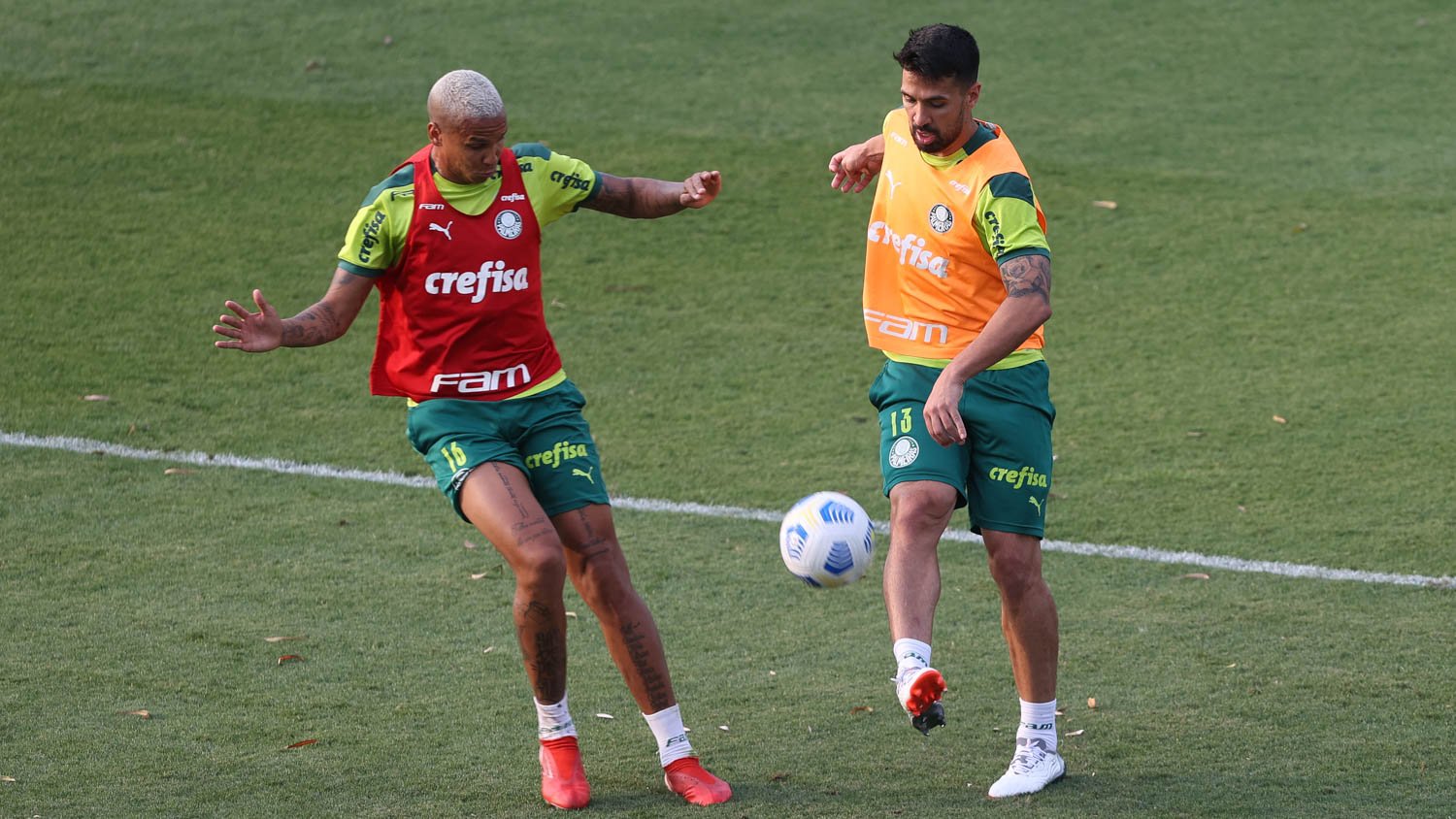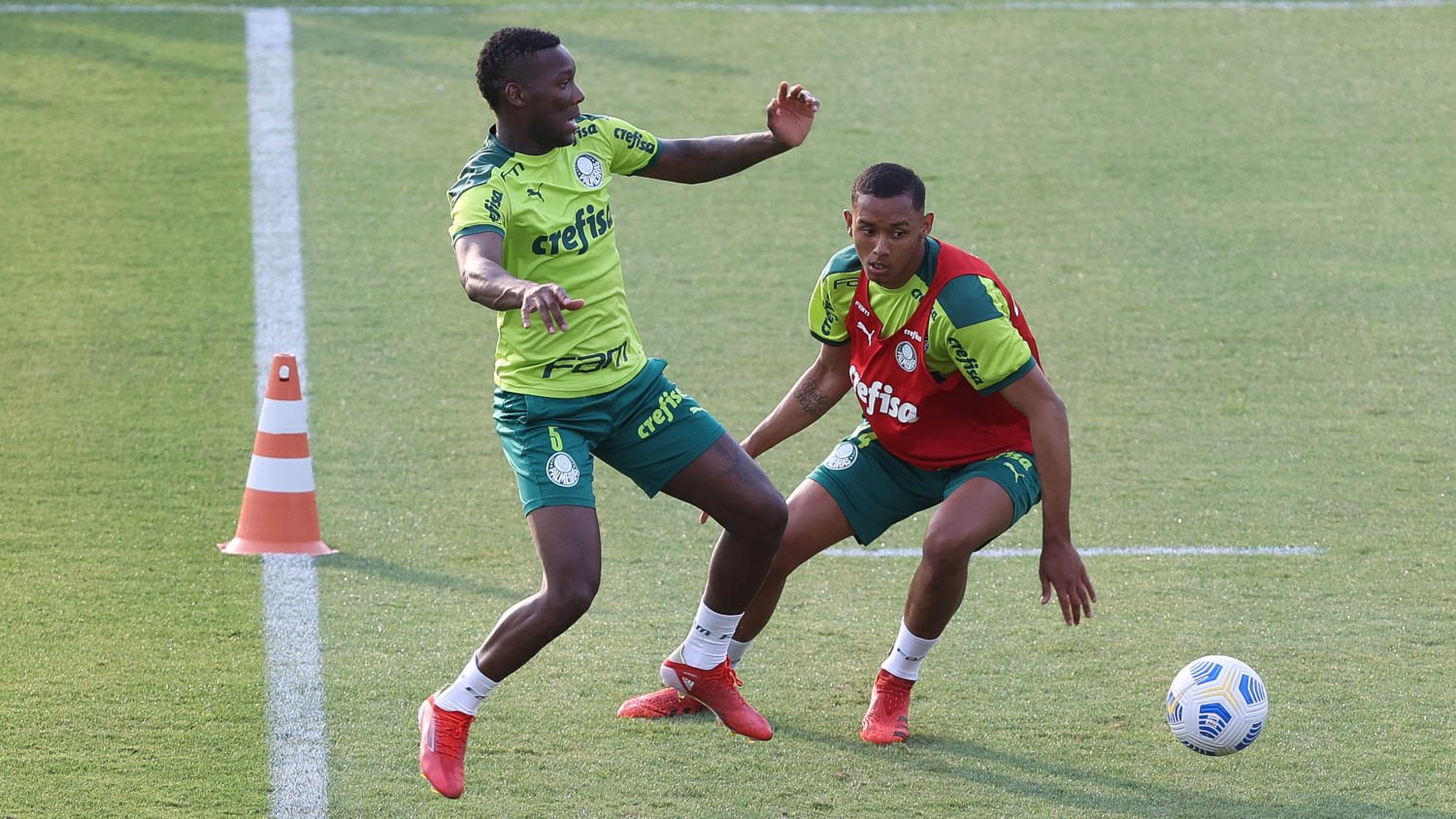 Os jogadores Deyverson e Luan (à dirieta) durante treinamento na Academia de Futebol (Foto: Cesar Greco/Palmeiras)