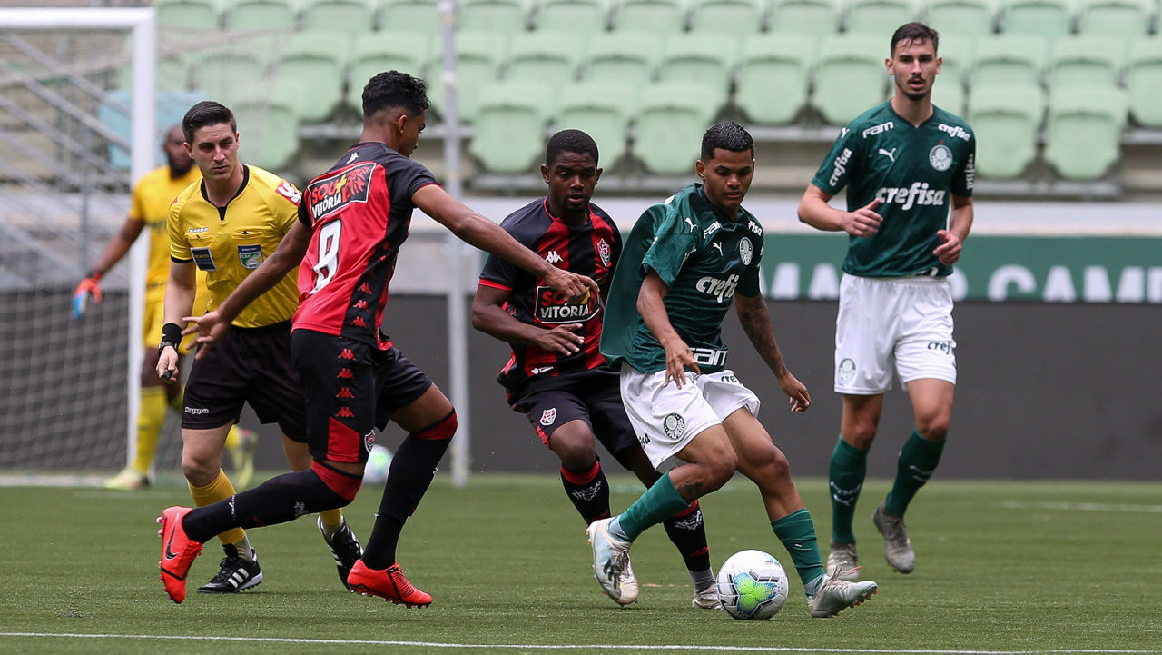 O time palmeirense começou melhor e criou as primeiras chances perigosas da partida em chutes de longa distância de Ian e Ramon Cirino. Em dois lances, porém, o Vitória levou a melhor nas costas da defesa alviverde, mas o goleiro Leandro, atento, antecipou as jogadas e afastou com os pés. O adversário ainda assustou no período com uma bola no travessão em cobrança de falta.