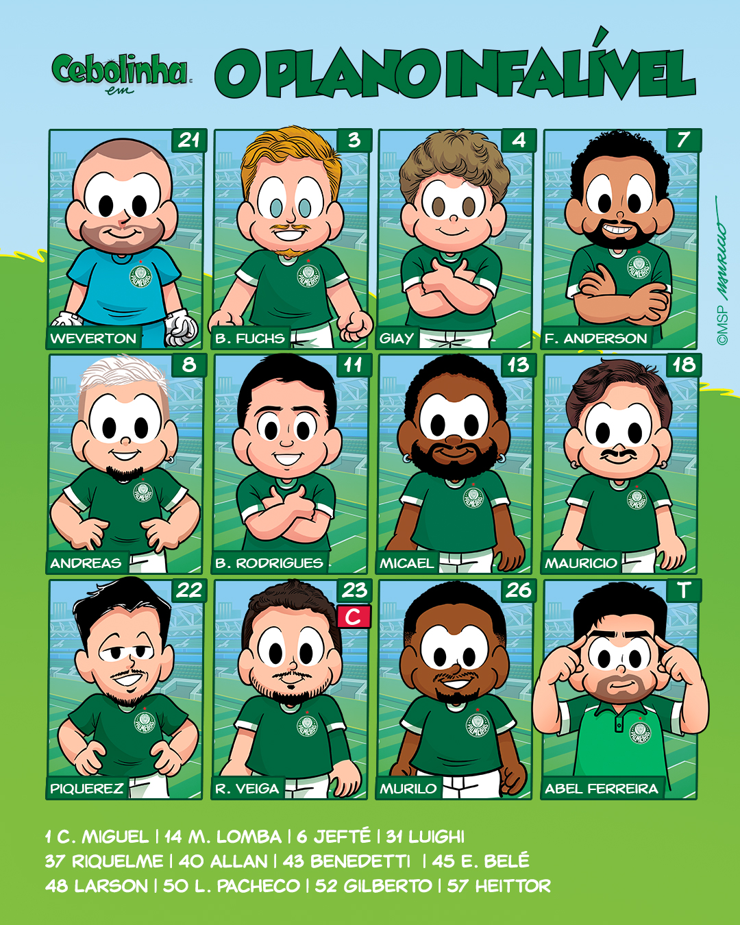 Para celebrar o Dia das Crianças, o Palmeiras promove uma ação especial e inédita no futebol brasileiro. O clube apresentou a escalação do time para o jogo deste sábado, contra o Juventude, pelo Brasileirão, com ilustrações da MSP Estúdios inspiradas nos traços de Mauricio de Sousa, artista que criou mais de 400 personagens, entre eles a Turma da Mônica, e que celebra 90 anos de idade neste mês de outubro.