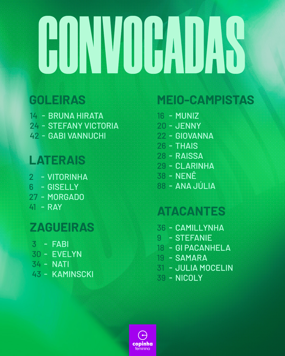O Palmeiras divulgou, nesta segunda-feira (01), a lista de jogadoras inscritas para a Copinha Feminina, que será realizada entre os dias 3 e 20 de dezembro, no Clube Recreativo Ceret, no bairro do Tatuapé, em São Paulo (SP). As partidas serão transmitidas por CazéTV, Record News, TV Gazeta, SporTV e o canal do Paulistão no YouTube.