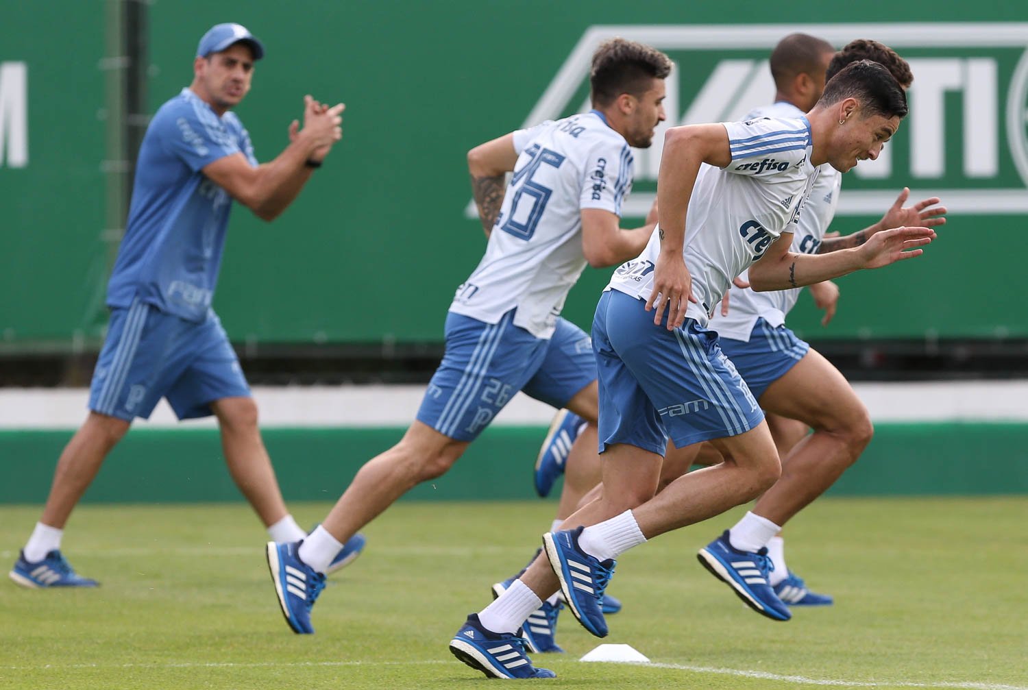 O técnico Roger Machado promoveu na manhã desta terça-feira (26), na Academia de Futebol, o primeiro treino em campo desde a reapresentação da equipe após o período de recesso devido à paralisação do Campeonato Brasileiro. Na última segunda-feira (25), o time havia realizado apenas exames físicos e cardiovasculares na parte interna do centro de excelência palestrino.