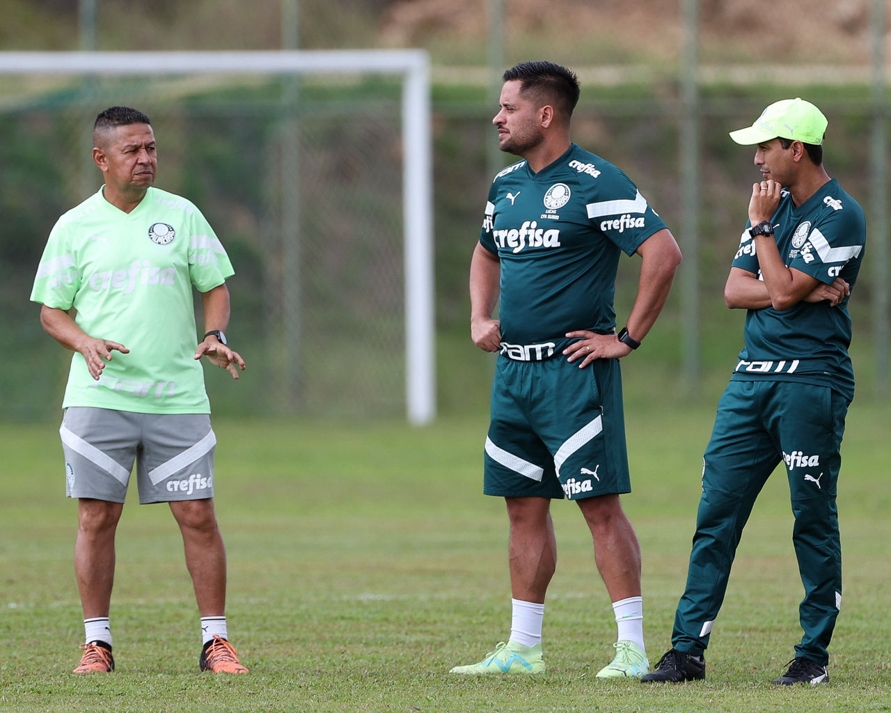 Lucas Andrade (centro) e seus auxiliares durante o treino (Foto: Fabio Menotti/Palmeiras/by Canon)