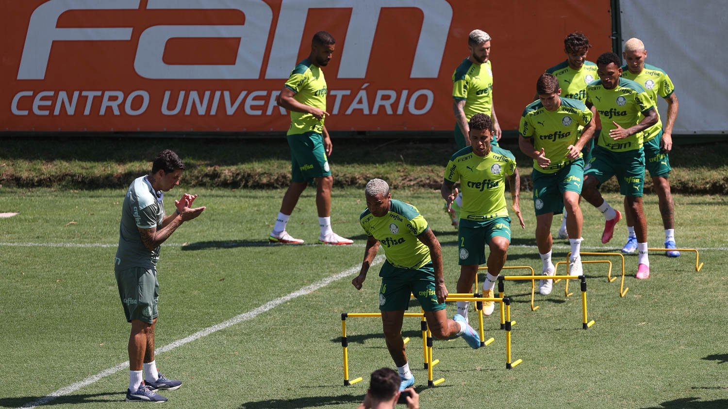Após exercícios de aquecimento, os jogadores foram divididos em dois grupos pela comissão técnica de Abel Ferreira: camisas verdes e coletes laranjas. Cada equipe realizou os movimentos no gramado com os adversários simulados por estacas.