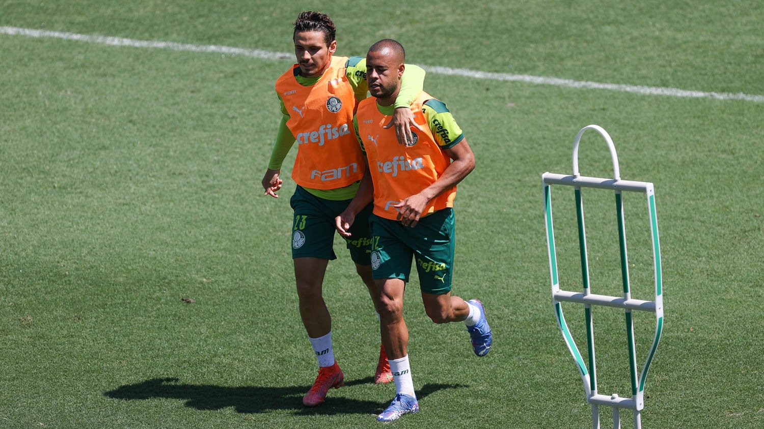 Após exercícios de aquecimento, os jogadores foram divididos em dois grupos pela comissão técnica de Abel Ferreira: camisas verdes e coletes laranjas. Cada equipe realizou os movimentos no gramado com os adversários simulados por estacas.