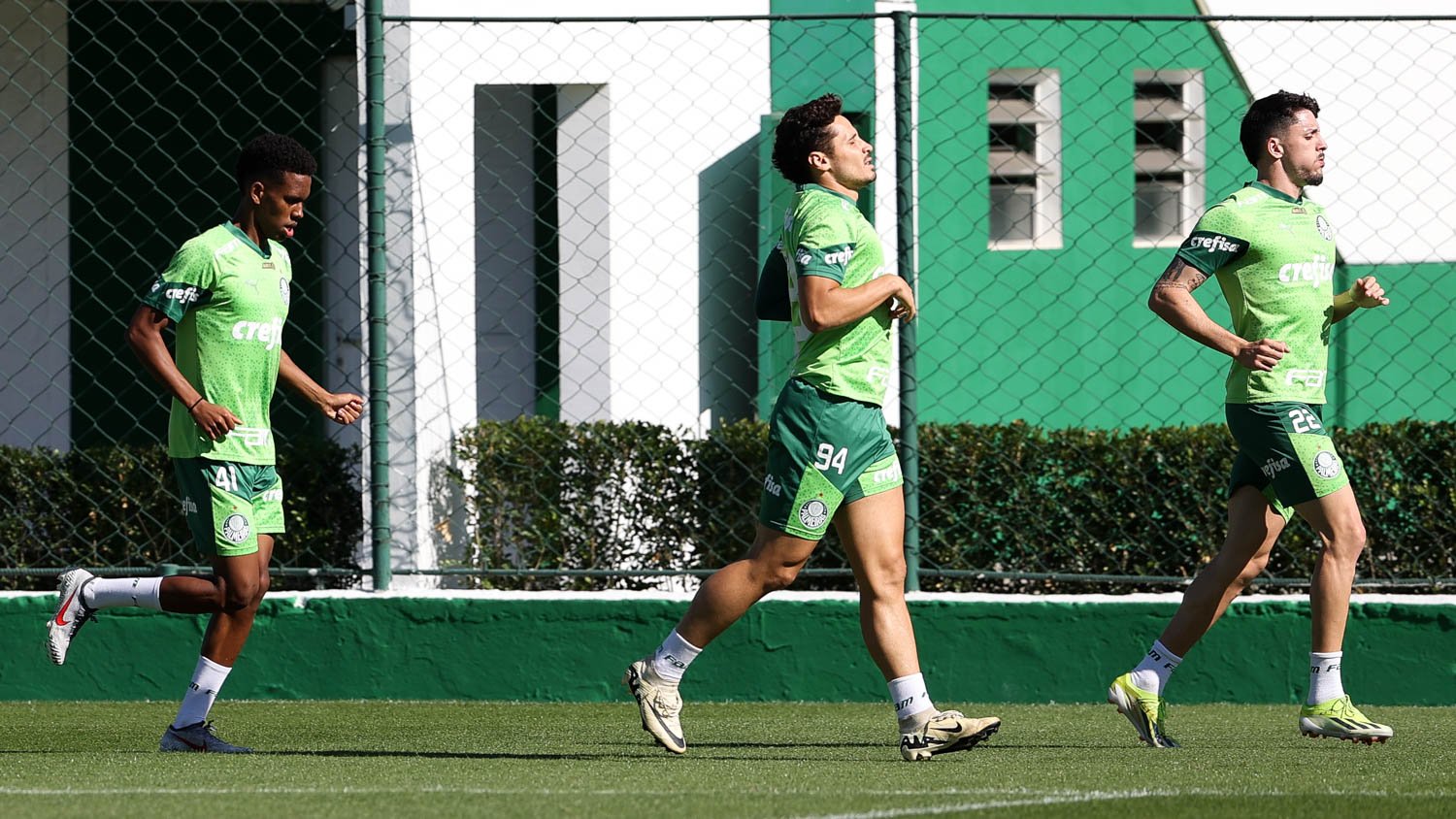 Estêvão, Raphael Veiga e Joaquín Piquerez (E/D) durante treinamento (Foto: Cesar Greco/Palmeiras/by Canon)
