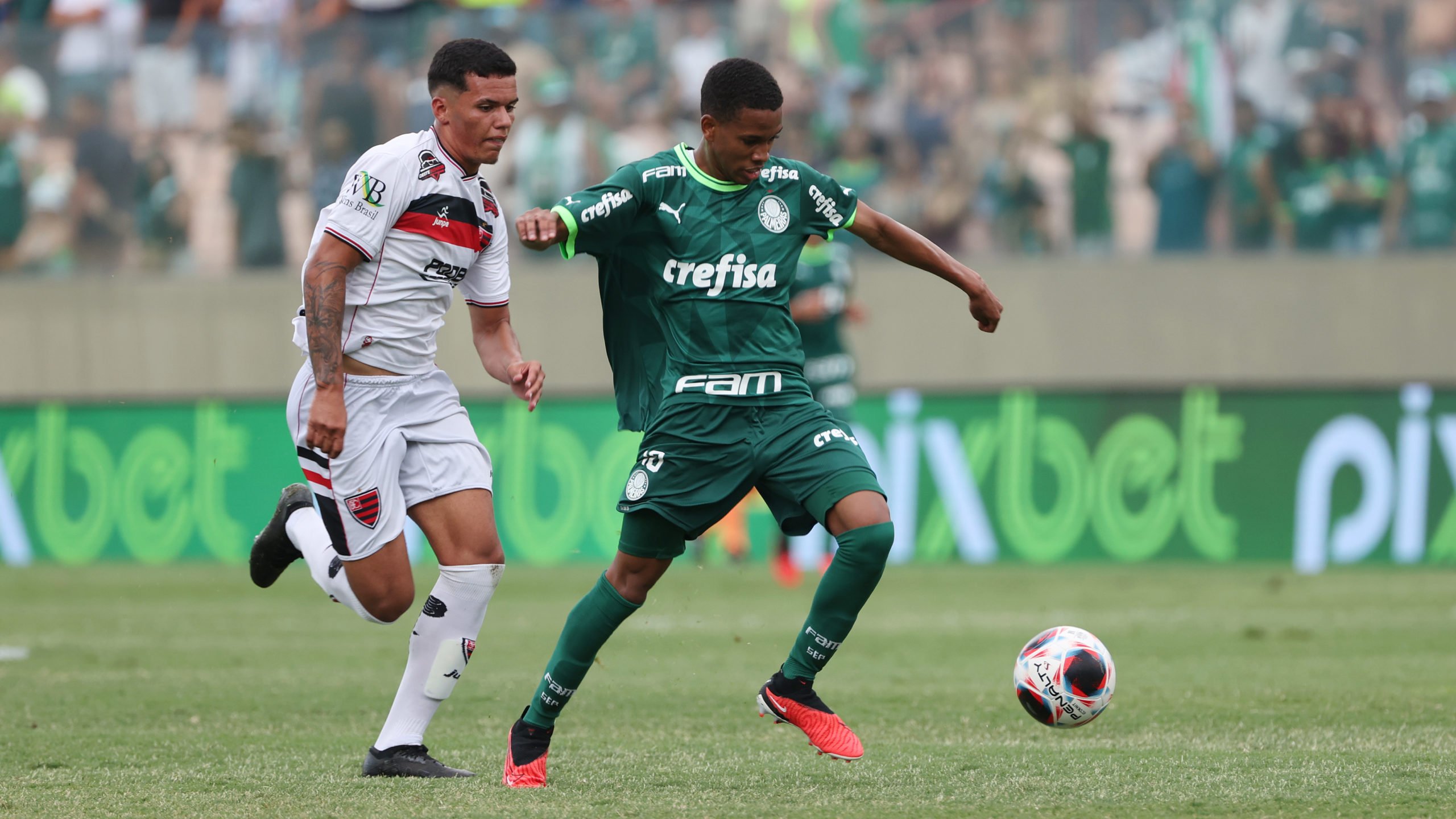 Com menos de um minuto do segundo tempo, Estêvão fez grande jogada e foi derrubado dentro da área. Na cobrança do pênalti, o camisa 10 mandou no ângulo esquerdo e recolocou o Palmeiras na frente. Logo em seguida, os refletores se apagaram com a chuva, e o jogo foi paralizado.