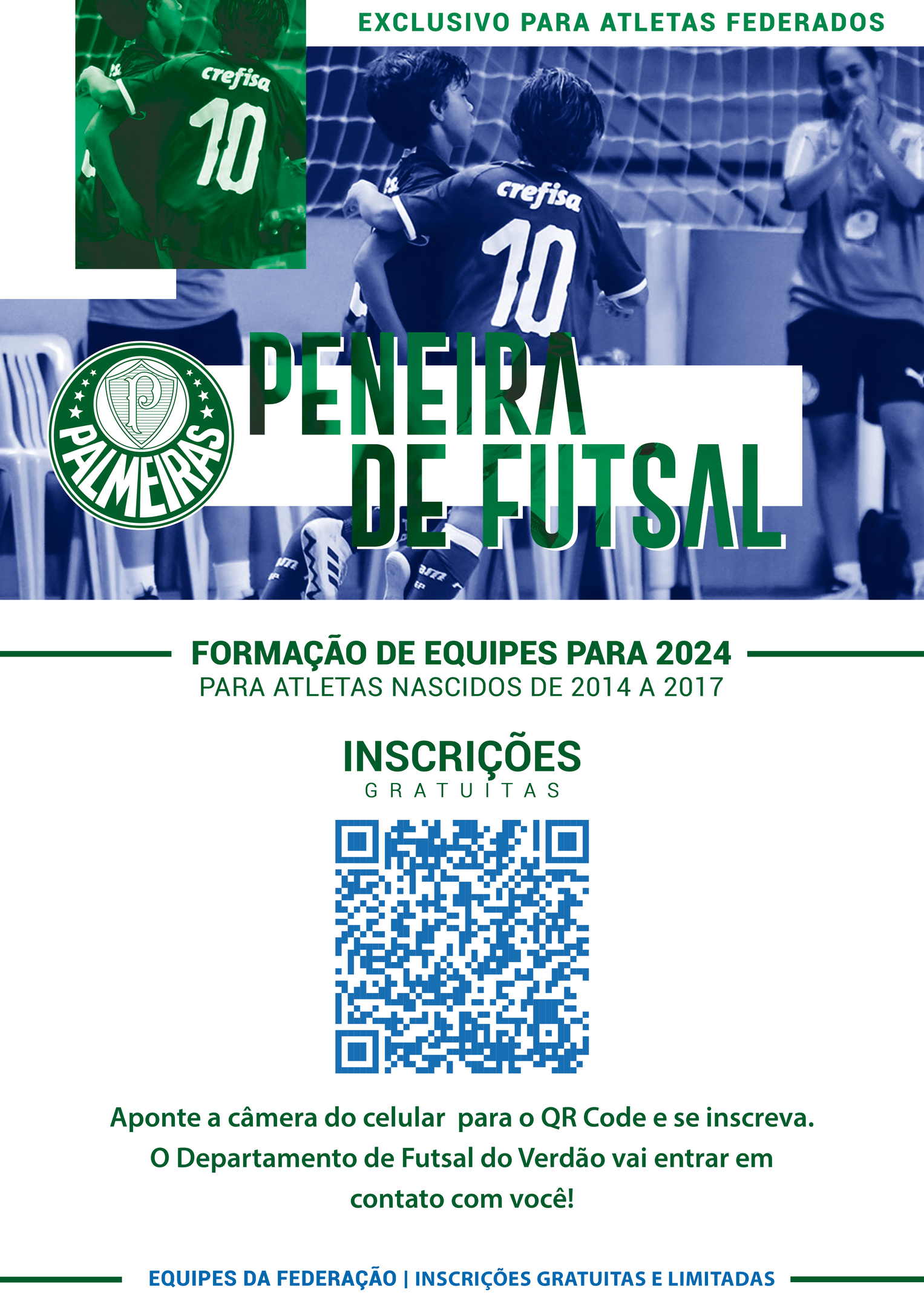 O Palmeiras iniciou nesta quinta-feira (18) as inscrições para a seletiva de futsal para a temporada de 2024. A peneira é destinada apenas para atletas federados das categoria Sub-7, Sub-8, Sub-9 e Sub-10 (nascidos entre 2014 e 2017). Para participar, basta clicar aqui e preencher o formulário.