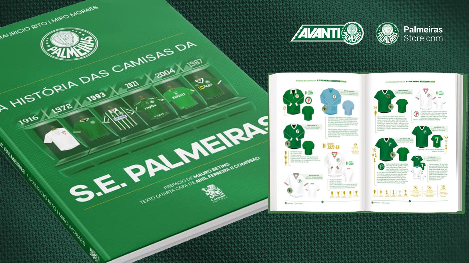 O Palmeiras preparou um livro que vai mexer com todos os corações palestrinos, independentemente da idade. A obra “A História das Camisas da S. E. Palmeiras”, elaborada por Mauricio Rito e Miro Moraes e publicada pela Camelot Editora, traz a ilustração e as principais informações de todas as camisas oficiais já utilizadas pelo Maior Campeão do Brasil ao longo de sua história, incluindo os mantos dos jogadores de linha, dos goleiros e também de treino – são mais de 1.200 camisas no total.