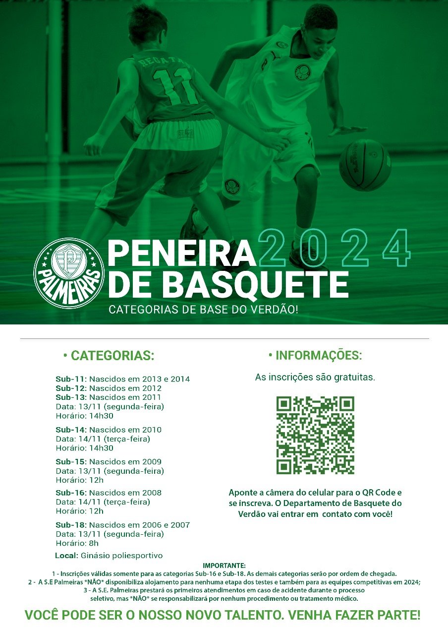 O Palmeiras vai promover, nos dias 13 e 14 de novembro, a tradicional peneira de basquete para captar atletas das categorias Sub-11 a Sub-18 (nascidos de 2006 a 2014). A seletiva acontece no Ginásio Palestra Italia, localizado no clube social do Verdão, na Rua Palestra Itália, 214 – Perdizes – São Paulo/SP.