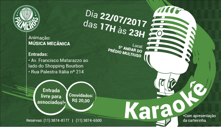 Palmeiras promove sessão de karaokê em julho; venha cantar e se divertir! Postado em 26 de junho de 2017 - 18:35 por admin-plm. Departamento de Comunicação