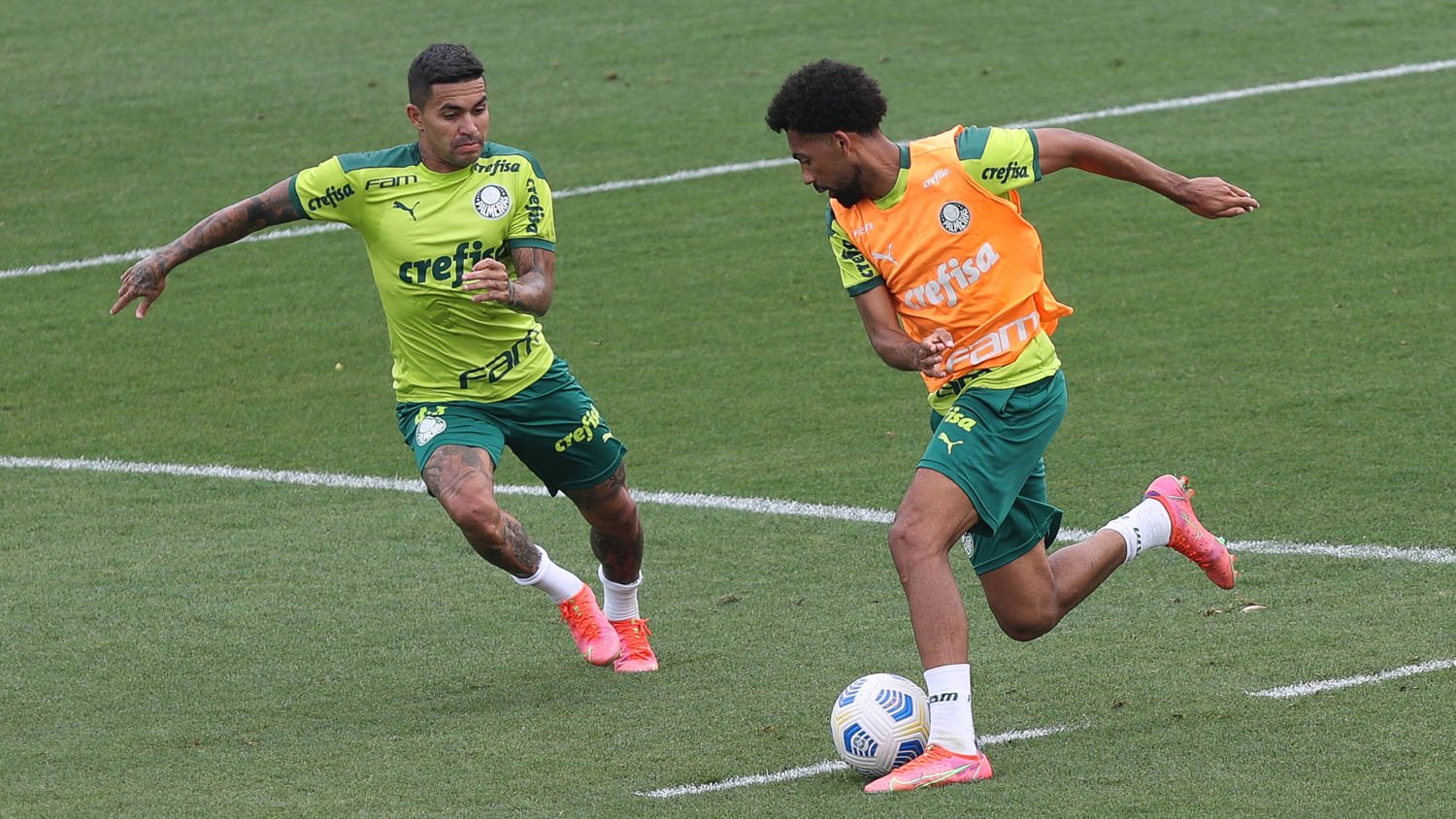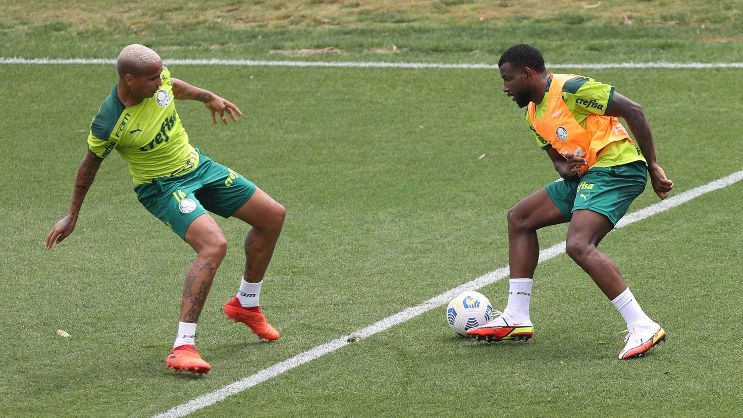 Os jogadores Deyverson e Danrley (à direita) durante treinamento na Academia de Futebol (Foto: Cesar Greco/Palmeiras)