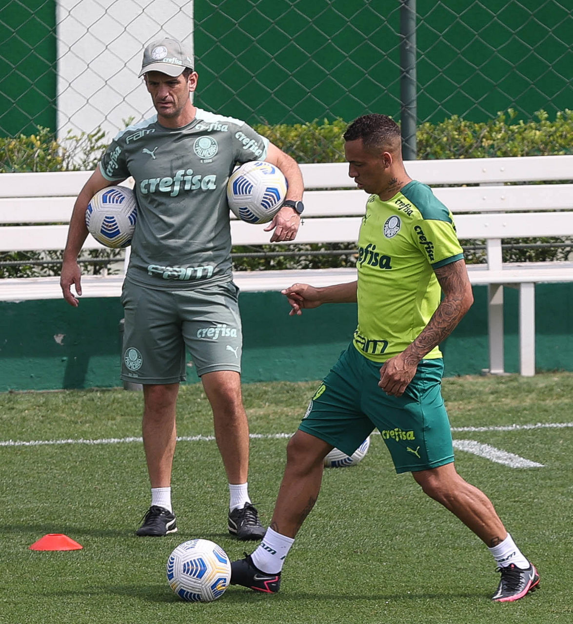 O atacante Luiz Adriano e goleiro Vinicius (à direita) durante treinamento na Academia de Futebol (Foto: Cesar Greco/Palmeiras)