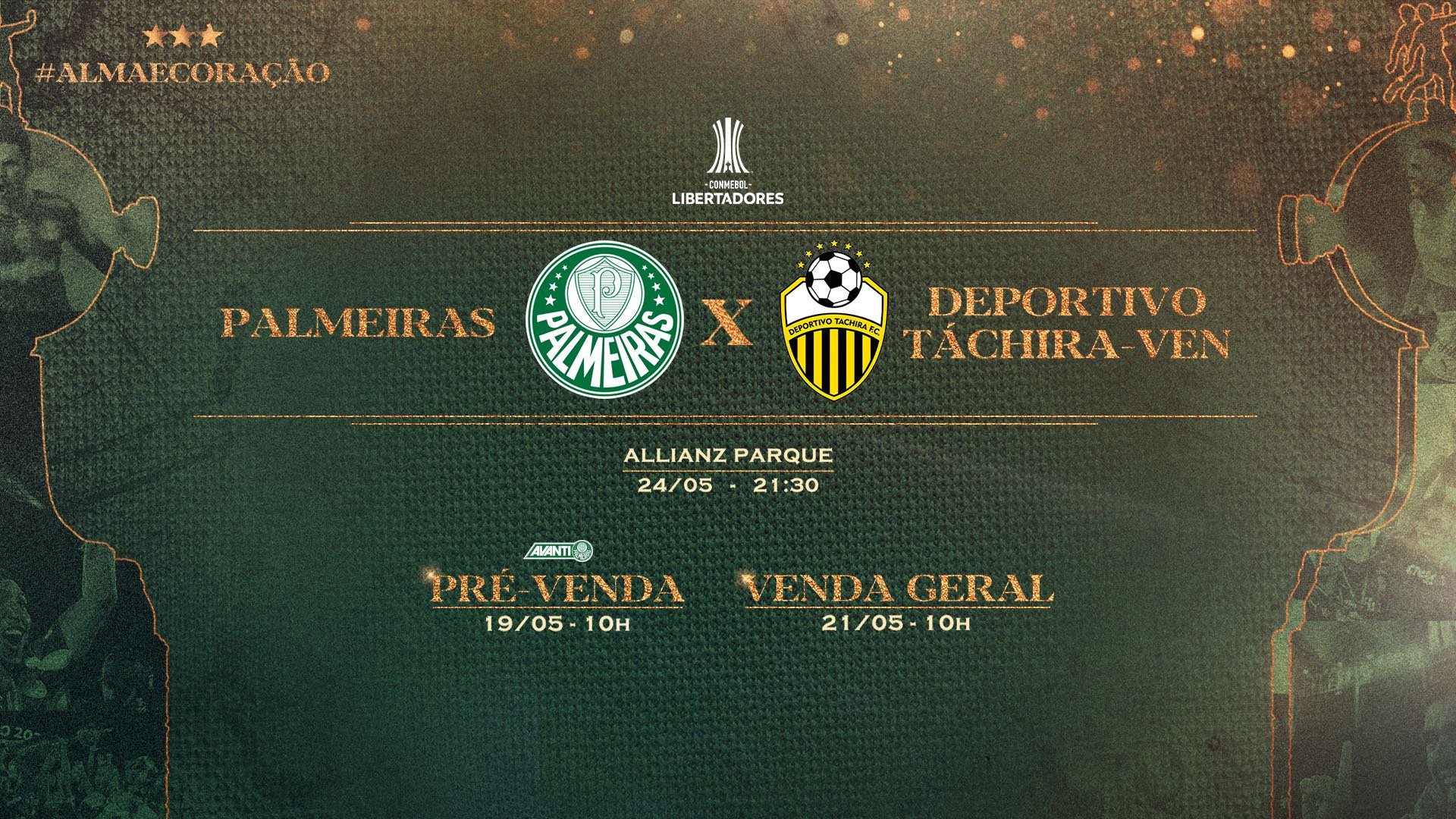 Os ingressos para o duelo com o Deportivo Táchira-VEN, que ocorrerá na terça-feira (24), às 21h30, no Allianz Parque, pela sexta rodada da fase de grupos da CONMEBOL Libertadores, têm valor mínimo de R$ 90,00 e estão à venda para todos os torcedores por meio do site www.ingressospalmeiras.com.br.