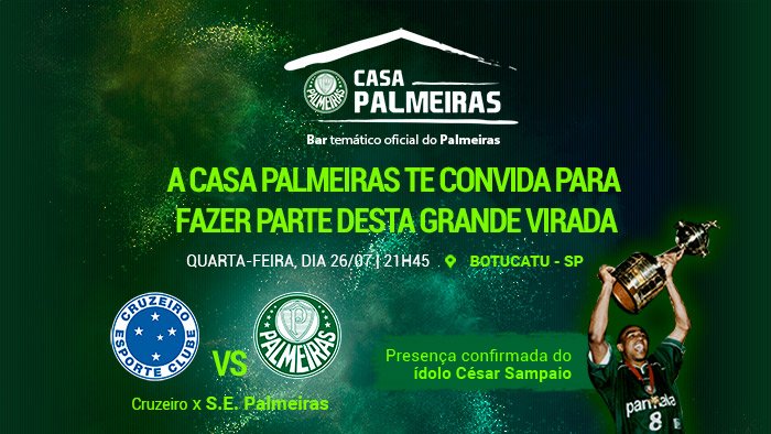 A Casa Palmeiras, bar temático itinerante do Verdão, desembarca na cidade de Botucatu-SP, nesta quarta-feira (26), para promover o jogo contra o Cruzeiro, pelas quartas de final da Copa do Brasil. Torcedores que adquirirem produtos na Academia Store da cidade terão acesso ao evento, que será realizado no Sinhô Sinhá Restaurante e Cachaçaria, a partir das 19h.