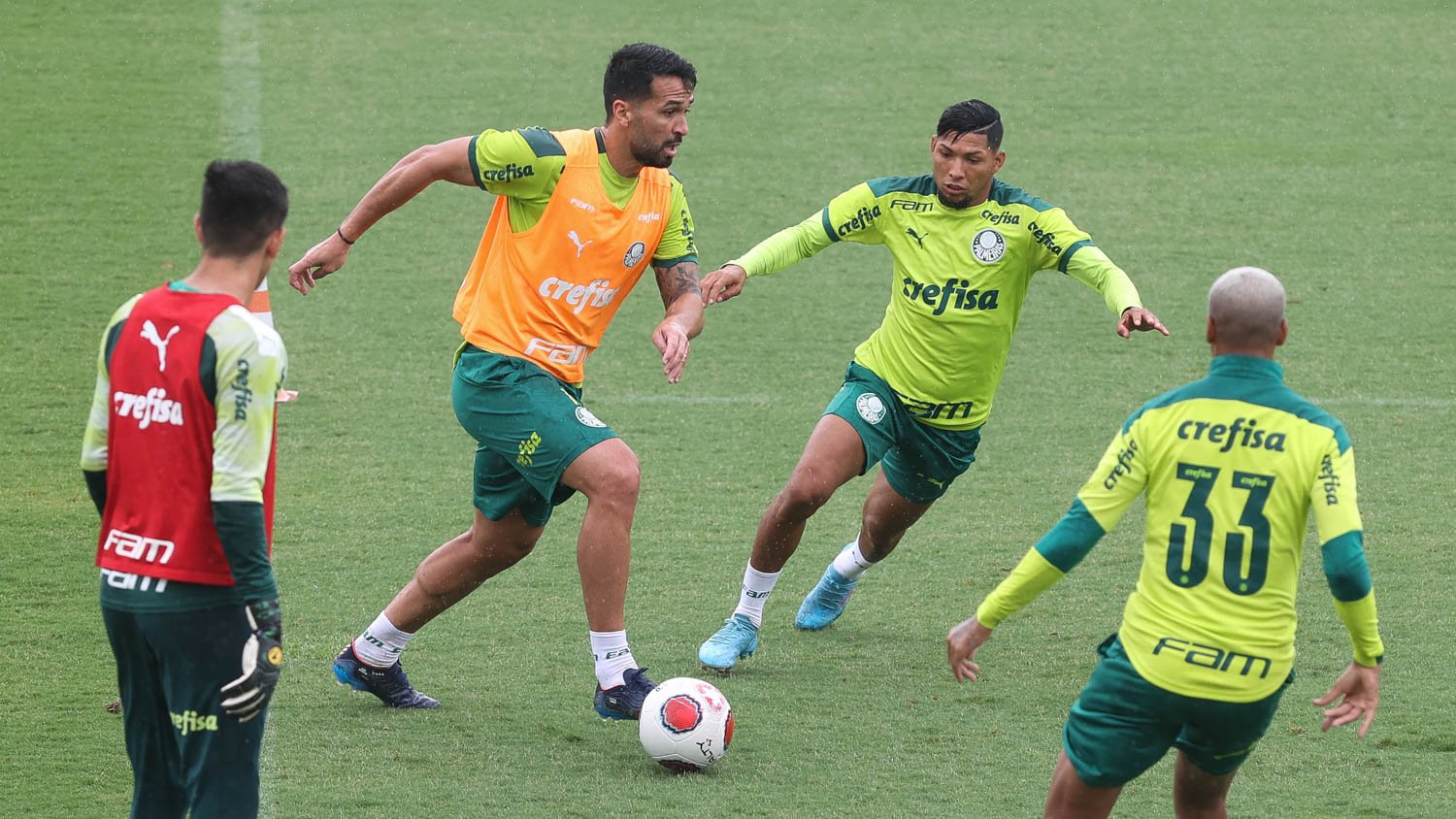 No campo, o técnico Abel Ferreira dividiu o treino em três partes. Na primeira, os jogadores fizeram um trabalho de posse de bola e marcação em campo reduzido. Depois, na parte tática, ensaiaram construção de jogadas – os jogadores com maior desgaste do jogo contra o São Bernardo deixaram o campo após um complemento físico à parte. Para fechar, os demais atletas foram divididos em dois grupos para atividades específicas de ataque e defesa.