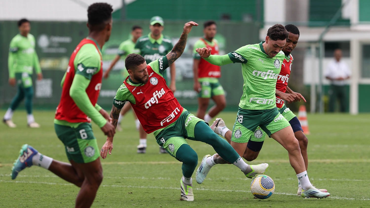 O Palmeiras deu sequência na manhã deste domingo (17), na Academia de Futebol, à preparação ao duelo com o Bahia, quarta-feira (20), às 18h, na Arena Fonte Nova, em Salvador (BA), pela 34ª rodada do Campeonato Brasileiro. Após ativação muscular no centro de excelência, os jogadores foram a campo e aprimoraram dinâmicas táticas (marcações, transições, contra-ataques, movimentações específicas e simulações de jogo). sob o comando da comissão de Abel Ferreira. Na parte final, os atletas aperfeiçoaram finalizações, totalizando perto de duas horas de trabalho.
