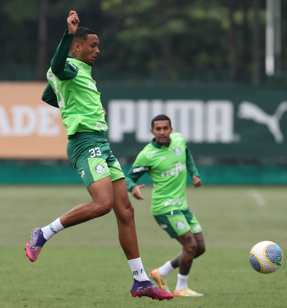 O jogadores Rômulo (à esquerda) e Raphael Veiga durante treinamento na Academia de Futebol (Foto: Cesar Greco/Palmeiras/by Canon)